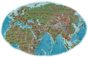 Cutting down through St. Petersberg we will hit Moscow, where we'll jump on a train heading towards the rising sun. Trans Siberian/ Trans Mongolian, east all the way. Possibly stopping off in Siberia, (looking to Maria for addresses), we'll hit Mongolia a few days later. Heading out of Ulan Bator to tread in the footsteps of Genghis Khan, horseback on the Mongolian steppe, into the Gobi desert.... before jumping on board the train again to find the Great wall, Tianamen Square and the sensory assault of China. Beijing.